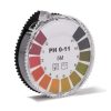 Universeel indicator papier, gradatie in stappen van 1,0 pH eenheden. Rol is 7 mm breed en 5 meter lang.